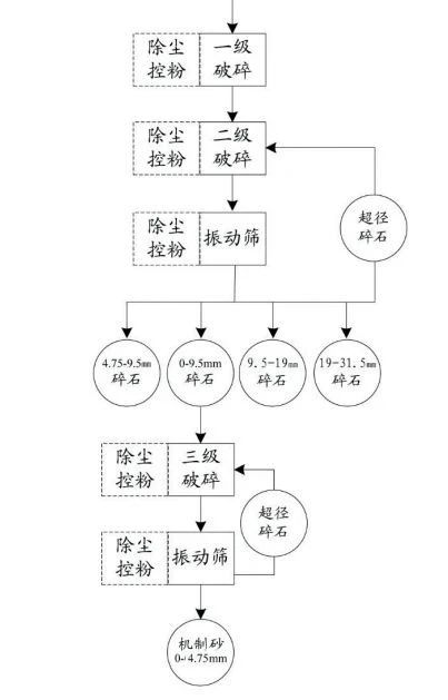 依據(jù)產(chǎn)能需求,該項目通過干法生產(chǎn)機制砂,并采用布袋除塵工藝進行加工過程的除塵和石粉含量的控制,一級破碎采用1臺PE600×900顎式破碎機,二級破碎采用1臺FP1315反擊式破碎機,三級破碎采用1臺PCX1212反擊式細碎機。