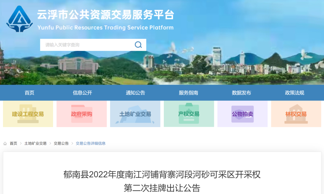 郁南縣2022年度南江河鋪背寨河段河砂可采區開采權第二次掛牌出讓公告