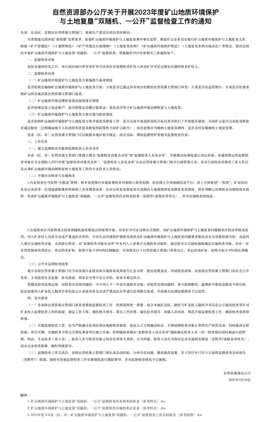 5月24日,自然資源部官網(wǎng)發(fā)布了《自然資源部辦公廳關(guān)于開展2023年度礦山地質(zhì)環(huán)境保護與土地復(fù)墾“雙隨機、一公開”監(jiān)督檢查工作的通知》(以下簡稱《通知》),表示擬開展監(jiān)督檢查工作。