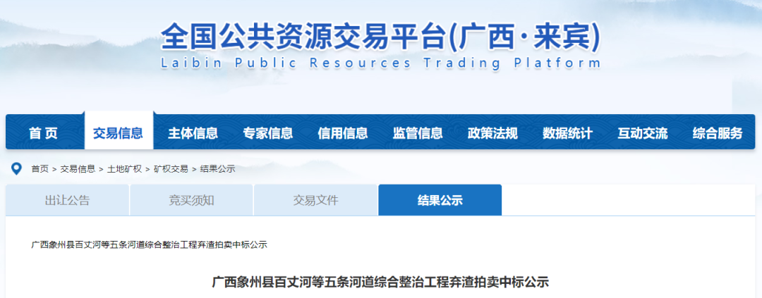 廣西象州縣百丈河等五條河道綜合整治工程棄渣拍賣結(jié)果公告