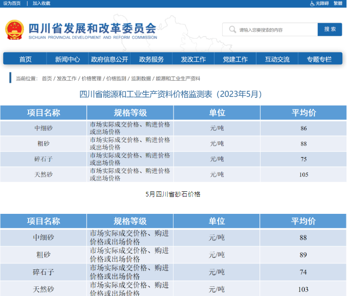 從四川省發(fā)改委了解,5月四川省砂石骨料價(jià)格中細(xì)砂86元/噸,粗砂均價(jià)88元/噸,碎石子均價(jià)75元/噸,天然砂均價(jià)105元/噸,砂石價(jià)格較4月整體微降,價(jià)格維穩(wěn)。