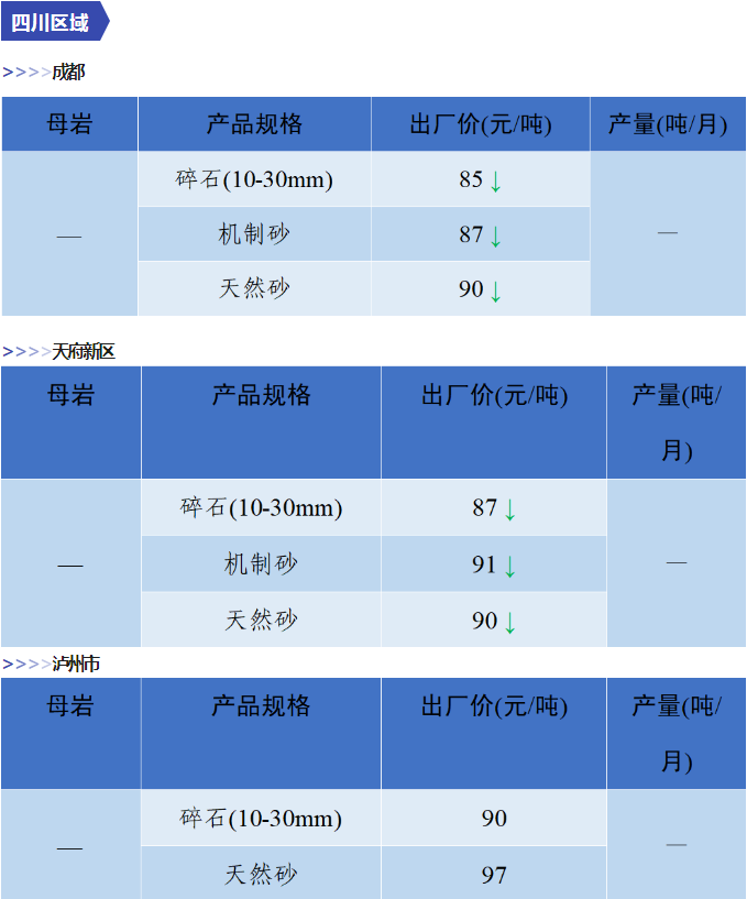 據(jù)統(tǒng)計(jì)2023年5月全國(guó)砂石骨料價(jià)格和產(chǎn)量了解(部分為代表性企業(yè)),5月份,四川砂石價(jià)格保持穩(wěn)定,省內(nèi)部分地區(qū)砂石價(jià)格呈下降趨勢(shì)。