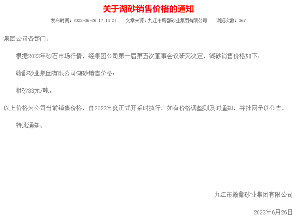 6月26日,江西省九江市贛鄱砂業(yè)集團有限公司根據(jù)2023年砂石市場行情,將其湖砂銷售價格調(diào)整為粗砂83元/噸,該價格自2023年度鄱陽湖砂正式開采時執(zhí)行。