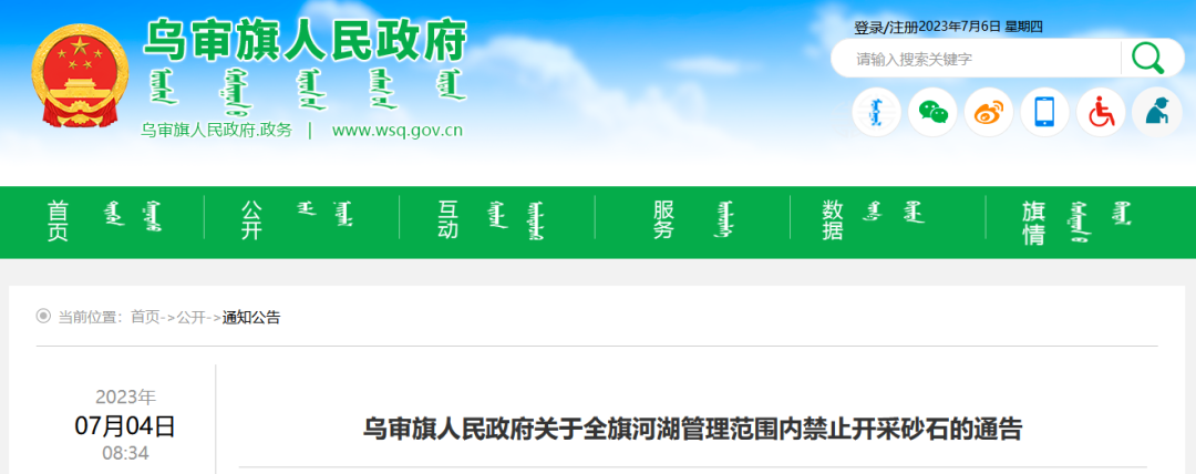 根據(jù)我旗河湖管理保護(hù)實(shí)際情況,我旗決定烏審旗全域河湖管理范圍內(nèi)禁止開采砂石。