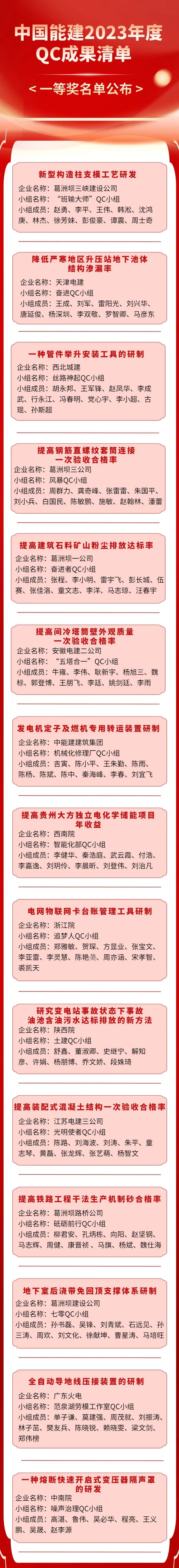 公司結合成果評審、現場發布情況,最終評選出2023年度優秀QC成果一等獎15項、二等獎25項、三等獎35項。獲評一等獎成果中名列前茅的將代表公司參加2023年中央企業QC成果發表賽以及中國質量協會、中國施工企業管理協會等更高級別的發布評審。