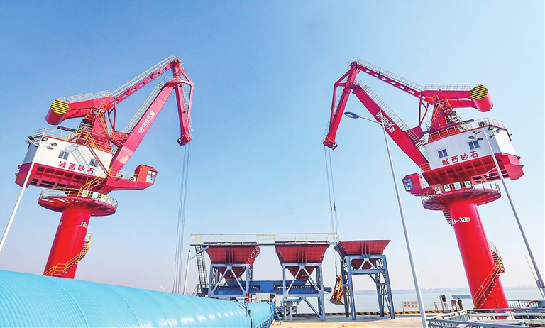 位于長江邊的城西砂石集散中心,一個橘紅色的塔吊抓手正把采砂船運來的湖砂送到封閉的傳輸帶中,通過傳輸帶再運往砂石倉庫里,成堆的金黃色砂子猶如金字塔般高高聳立著,正等待著裝車運往各地……
