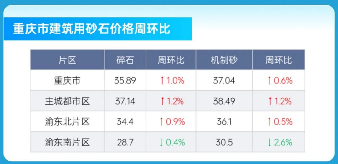 主城都市區(qū)碎石、機制砂坑口價均上漲1.2%、拉高全市價格0.8個百分點;
