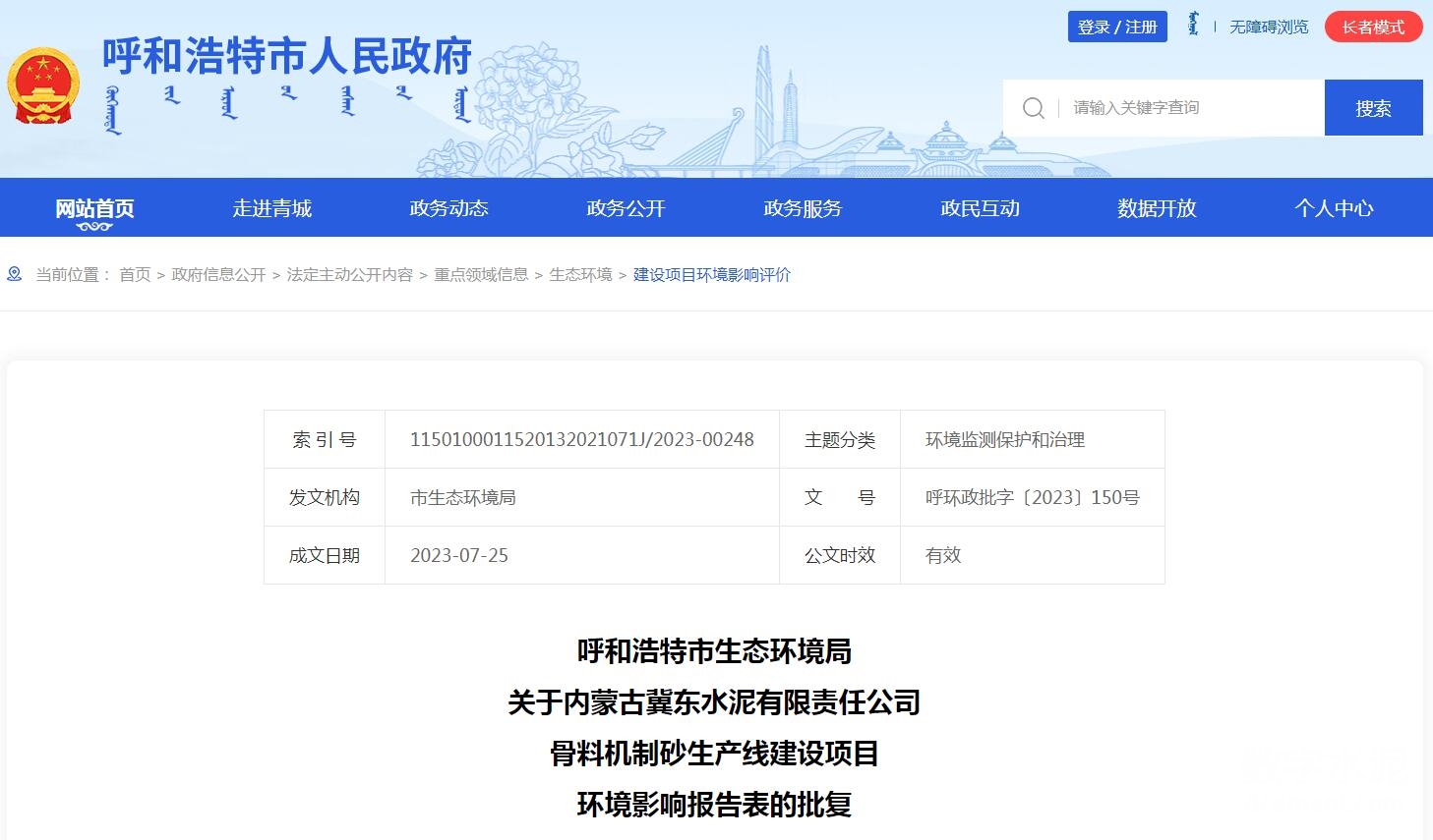 近期,根據(jù)呼和浩特市生態(tài)環(huán)境局關(guān)于內(nèi)蒙古冀東水泥有限責(zé)任公司骨料機(jī)制砂生產(chǎn)線建設(shè)項(xiàng)目環(huán)境影響報(bào)告表的批復(fù)顯示,該項(xiàng)目位于呼和浩特市武川縣內(nèi)蒙古冀東水泥有限責(zé)任公司廠區(qū)和巨金..