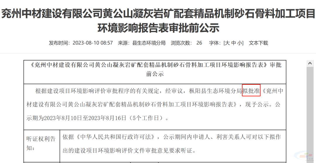 近日,安徽銅陵市樅陽(yáng)生態(tài)環(huán)境分局?jǐn)M批準(zhǔn)《兗州中材建設(shè)有限公司黃公山凝灰?guī)r礦配套精品機(jī)制砂石骨料加工項(xiàng)目環(huán)境影響報(bào)告表》。