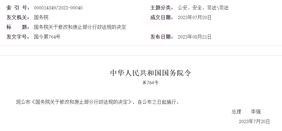日前,國(guó)務(wù)院總理李強(qiáng)簽署《國(guó)務(wù)院關(guān)于修改和廢止部分行政法規(guī)的決定》國(guó)務(wù)院令,并于2023年08月21日發(fā)布,自公布之日起施行。