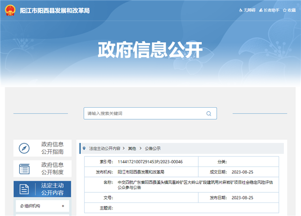 2023年6月30日,中交第四航務(wù)工程局有限公司以16億元競(jìng)得廣東省陽西縣溪頭鎮(zhèn)鳳凰嶺礦區(qū)大嶺山礦段建筑用片麻巖礦。該礦建筑用片麻巖(含少量花崗巖等)資源量合計(jì)礦石量18376.3萬方(約合49616.01萬噸),生產(chǎn)規(guī)模900萬方/年(約2412萬噸/年),擬出讓年限20年。