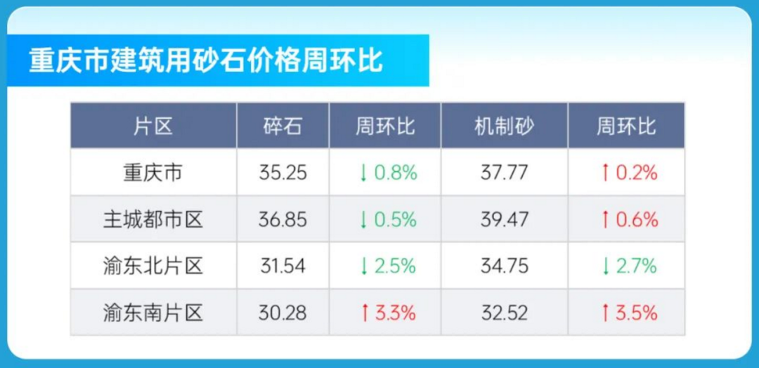 渝東北片區(qū)碎石、機(jī)制砂坑口價分別下跌2.5%、2.7%,分別拉低全市價格0.41、0.59個百分點(diǎn);