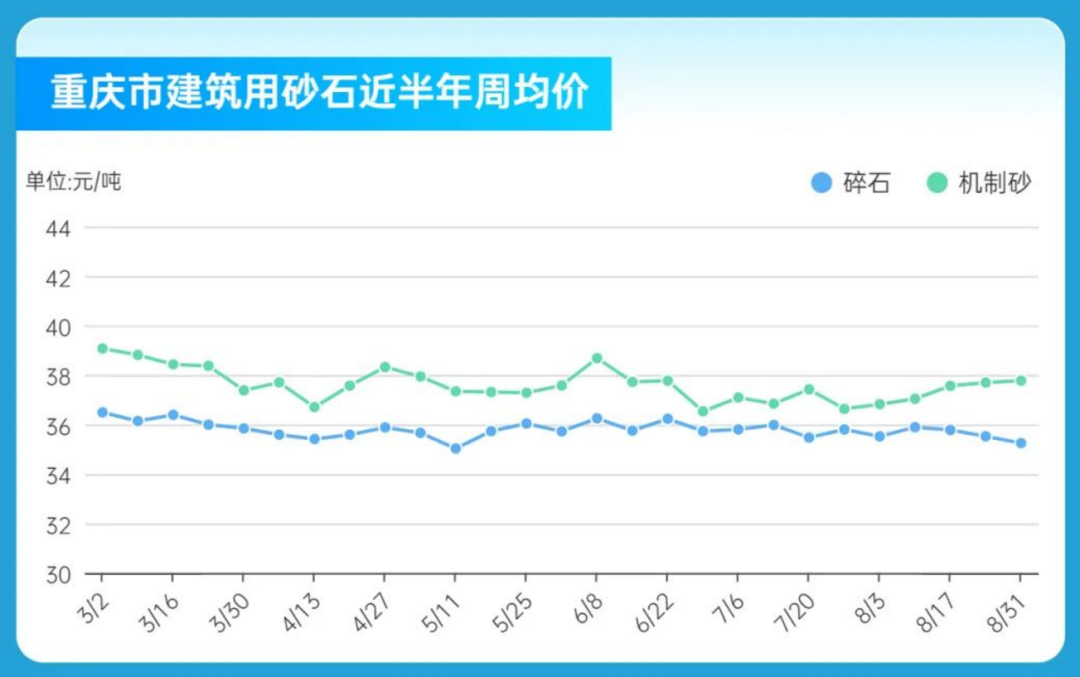 2023年8月25日至8月31日,重慶市建筑用砂石坑口價微幅波動,其中,碎石坑口均價每噸35.25元、周環(huán)比微跌0.8%,機(jī)制砂坑口均價每噸37.77元、周環(huán)比微幅上漲0.2%。