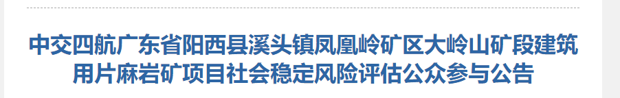 近日,中交集團(tuán)旗下中交第四航務(wù)工程局有限公司競得的廣東省陽西縣溪頭鎮(zhèn)鳳凰嶺礦區(qū)大嶺山礦段建筑用片麻巖礦項(xiàng)目目前正在編制社會(huì)穩(wěn)定風(fēng)險(xiǎn)評(píng)估報(bào)告,距離開工建設(shè)又近了一步。