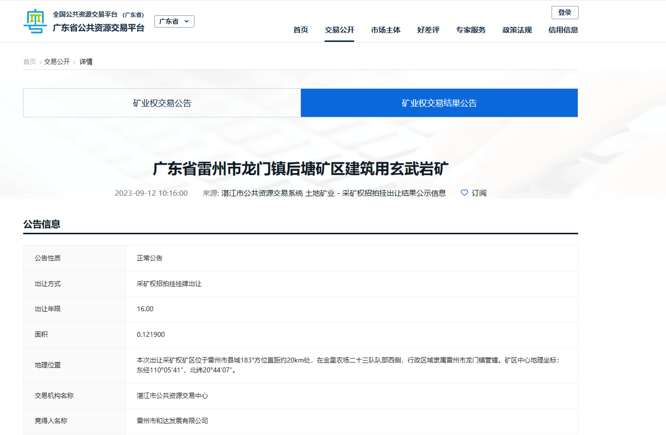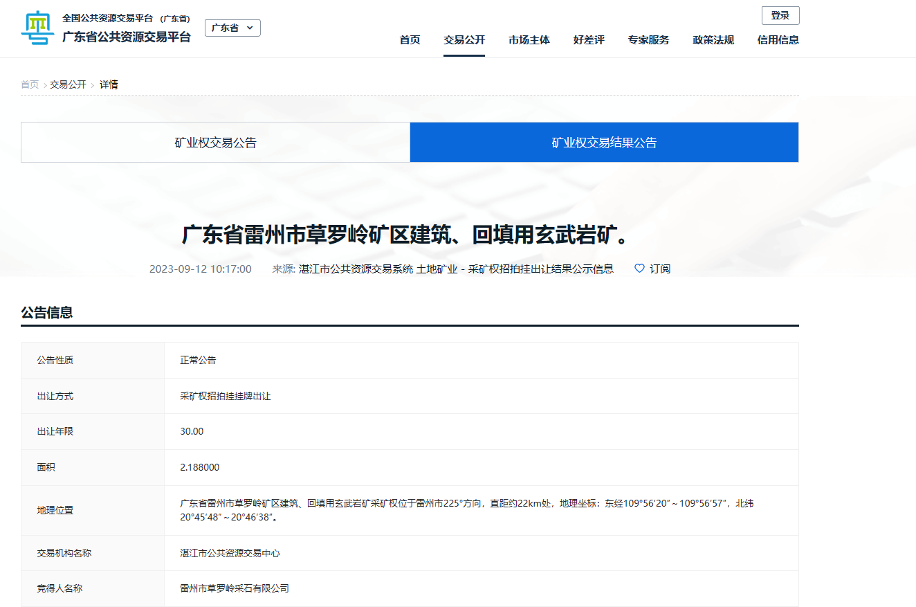 9月12日,湛江市公共資源交易中心成功競(jìng)出廣東省雷州市龍門鎮(zhèn)后塘礦區(qū)建筑用玄武巖礦、廣東省雷州市草羅嶺礦區(qū)建筑、回填用玄武巖礦兩宗礦權(quán),成交價(jià)共為2.91億元。