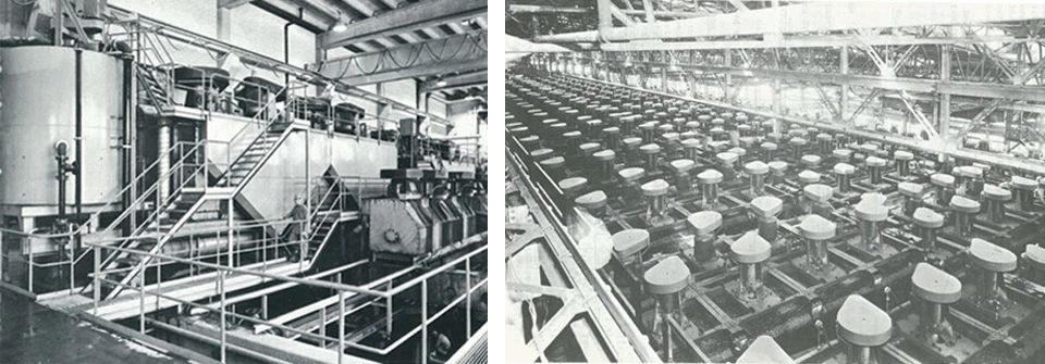 1973年,大型OK-16浮選機(jī)在奧托昆普Hammasiahti選礦廠首次投入商業(yè)生產(chǎn)(左圖);1976年肯尼科特銅業(yè)公司,Bonneville選礦廠粗選:45行,每行16個(gè)槽(右圖)。