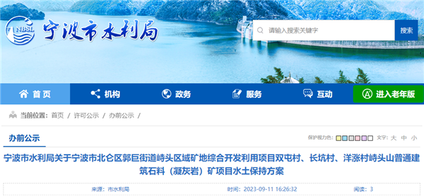 9月11日,浙江省寧波市水利局發(fā)布寧波市北侖區(qū)郭巨街道峙頭區(qū)域礦地綜合開(kāi)發(fā)利用項(xiàng)目雙屯村、長(zhǎng)坑村、洋漲村峙頭山普通建筑石料(凝灰?guī)r)礦項(xiàng)目水土保持方案報(bào)告書(shū)擬審批公示。該項(xiàng)目總投資26億元,年生產(chǎn)規(guī)模1020萬(wàn)噸,計(jì)劃2023年10月開(kāi)工,2027年9月完工,總工期48個(gè)月。建設(shè)單位寧波浙青礦業(yè)有限公司,為國(guó)有企業(yè)。