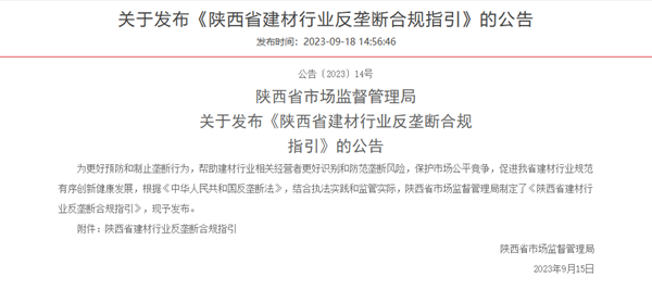 日前,為預防和制止壟斷行為,幫助建材行業相關經營者更好識別和防范壟斷風險,陜西省市場監管局發布《陜西省建材行業反壟斷合規指引》。