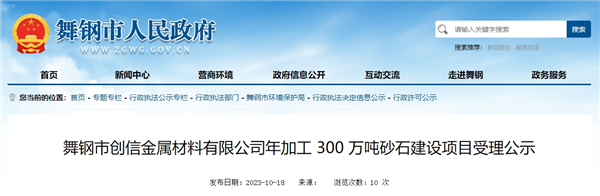 近日,河南省舞鋼市人民政府發(fā)布舞鋼市創(chuàng)信金屬材料有限公司年加工300萬噸砂石建設(shè)項目環(huán)評受理公示。該項目總投資1.5億元,主要年加工道渣石150萬噸、鑄造砂30萬噸、12石子60萬噸、機制砂60萬噸。
