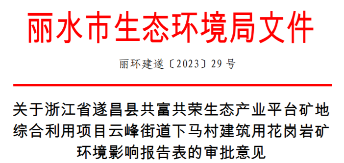 關于浙江省遂昌縣共富共榮生態(tài)產(chǎn)業(yè)平臺礦地綜合利用項目云峰街道下馬村建筑用花崗巖礦環(huán)境影響報告表的審批意見