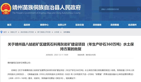 日前,雷鳴科化旗下湖南省靖州縣八姑巖礦區(qū)建筑石料用灰?guī)r礦建設(shè)項(xiàng)目(年生產(chǎn)砂石360萬(wàn)噸)水土保持方案獲批。據(jù)了解,該工程總投資56000萬(wàn)元(5.6億元),工程基建期于2023年9月動(dòng)工,計(jì)劃2024年6月完工,總工期10個(gè)月。