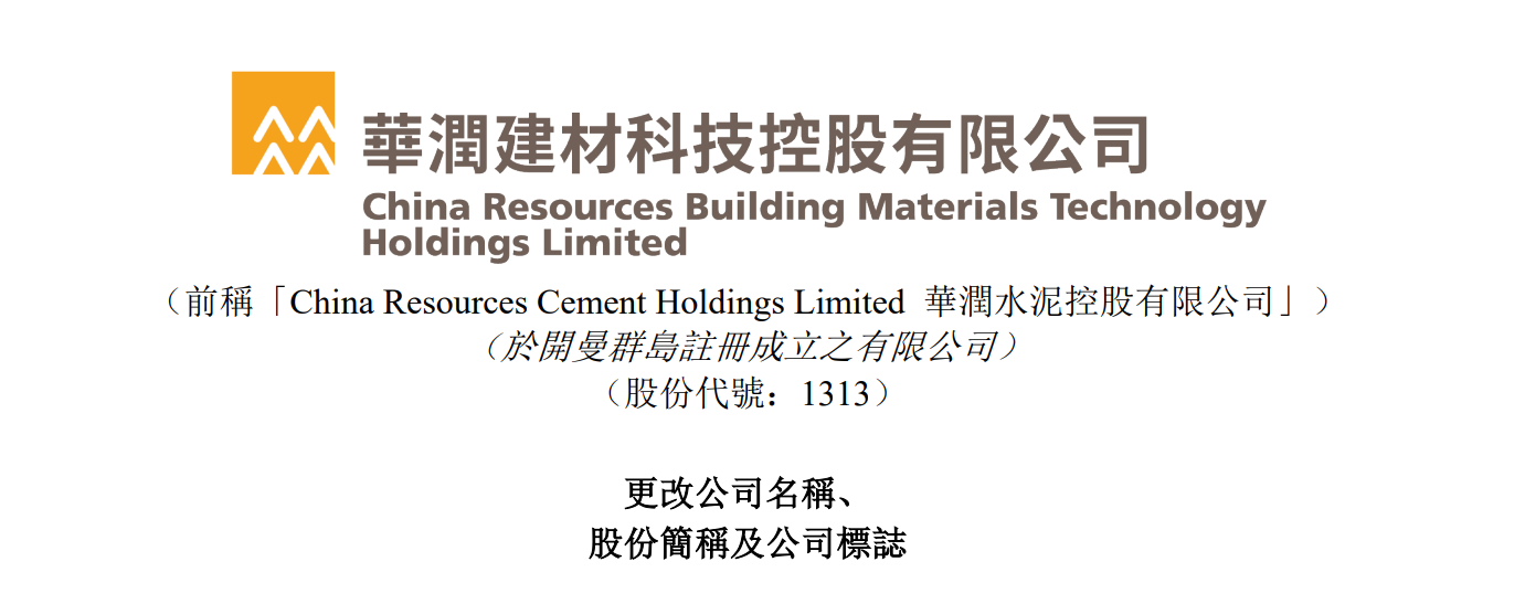該公司于聯交所買賣的公司股份的中文股份簡稱將由“華潤水泥控股”變更為“華潤建材科技”,自2023年12月8日上午9時正起生效。公司的股份代號“1313”維持不變。