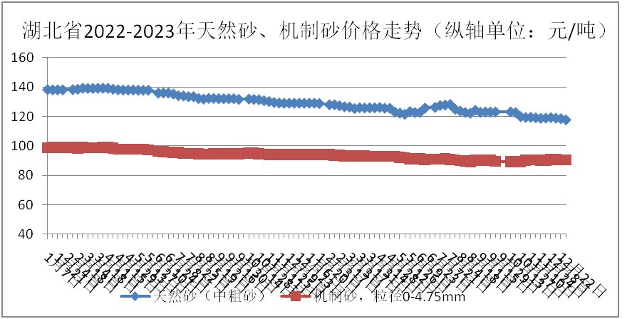 近日,湖北省價格監(jiān)測中心發(fā)布12月份湖北市場砂石價格,其中,天然砂(中粗砂)、機(jī)制砂全省均價分別為118.83元/噸、90.47元/噸,碎石(粒徑5-16mm)、碎石(粒徑17-31.5mm)全省均價分別為80.02元/噸、86.30元/噸,砂石價格保持相對穩(wěn)定。
