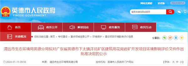 1月15日,廣東省清遠(yuǎn)市生態(tài)環(huán)境局英德分局發(fā)布下太鎮(zhèn)洋坑礦區(qū)建筑用花崗巖礦開發(fā)項(xiàng)目環(huán)境影響評(píng)價(jià)文件擬批準(zhǔn)決定的公示。該項(xiàng)目總投資30.1億元,生產(chǎn)規(guī)模400萬方/年,平均年產(chǎn)碎石448.93萬方、機(jī)制砂203.96萬方。