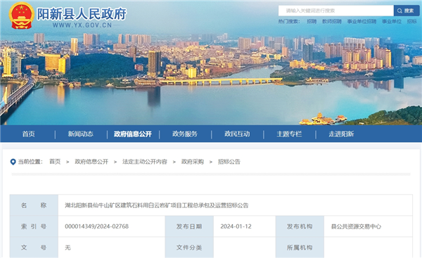 1月12日,湖北省黃石市陽新縣人民政府發(fā)布仙牛山礦區(qū)建筑石料用白云巖礦項目工程總承包及運營項目招標(biāo)公告。據(jù)了解,該項目建設(shè)規(guī)模為500萬噸/年,合同估算價7070萬元,計劃工期(含施工圖設(shè)計)365日歷天,計劃開始工作日期2024年2月20日。投標(biāo)文件遞交截止時間為2024年2月4日9時。招標(biāo)人湖北仙牛山綠色建筑材料有限公司為當(dāng)?shù)貒衅髽I(yè)。