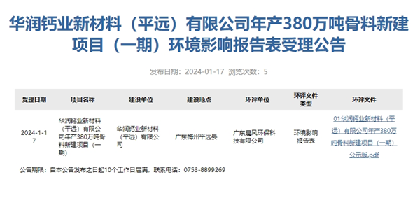 據(jù)悉,日前,華潤鈣業(yè)新材料(平遠(yuǎn))有限公司年產(chǎn)380萬噸骨料項目環(huán)評獲受理。據(jù)介紹,該項目資源儲量4339.4萬噸,生產(chǎn)規(guī)模380萬噸/年,其中,水泥用石灰?guī)r為280萬噸/年、建筑用石灰?guī)r為100萬噸/年,綜合服務(wù)年限為15年。