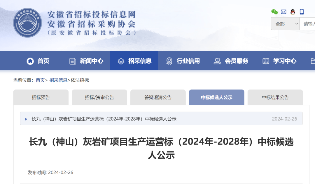 2月26日,安徽省招標投標信息網(wǎng)發(fā)布長九(神山)灰?guī)r礦項目生產(chǎn)運營標(2024年-2028年)中標候選人公示。中標候選人第1名為中國水利水電第八工程局有限公司,投標報價為7054790376元。