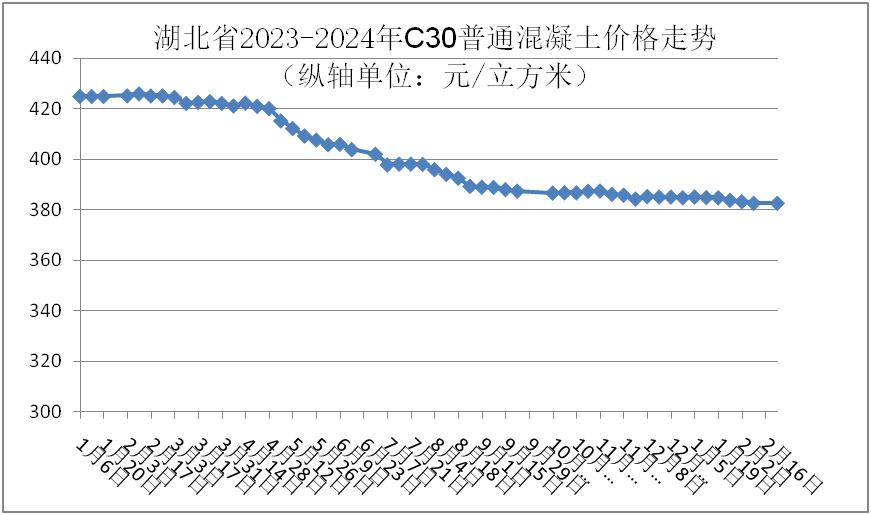 監(jiān)測(cè)數(shù)據(jù)顯示:2月份,強(qiáng)度等級(jí)C30普通混凝土全省均價(jià)為382.88元/立方米,環(huán)比下跌0.48%,同比下跌10.01%。