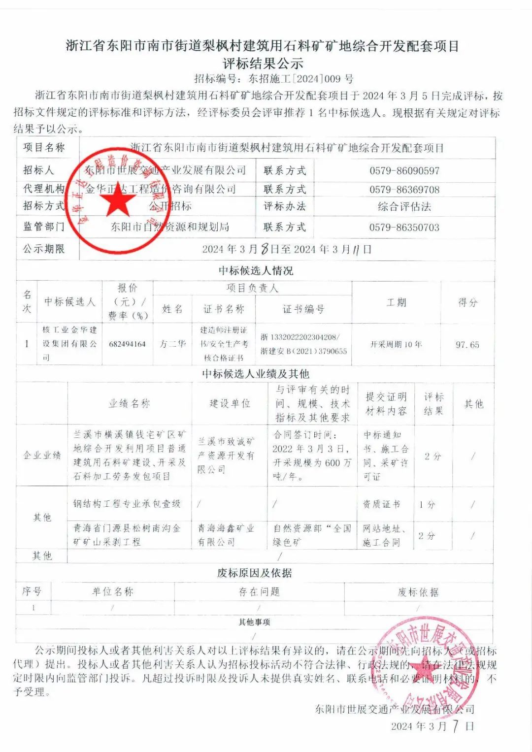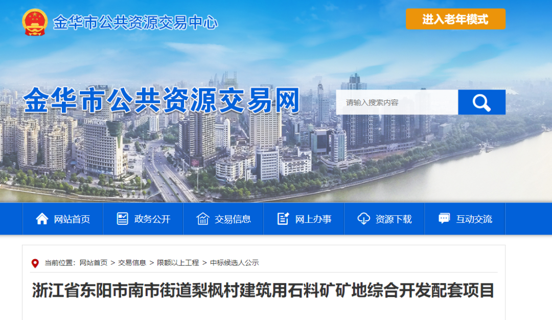 近日,浙江省金華市公共資源交易網(wǎng)發(fā)布東陽市南市街道梨楓村建筑用石料礦礦地綜合開發(fā)配套項(xiàng)目中標(biāo)候選人公示,核工業(yè)金華建設(shè)集團(tuán)有限公司以約6.8億元(68249.4164萬元)報(bào)價(jià)金額成為第一候選人。