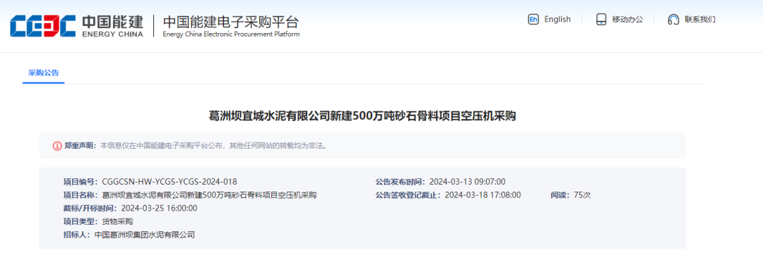 近日,中國能建電子采購平臺公示旗下葛洲壩宜城水泥有限公司新建500萬噸砂石骨料項目空壓機采購公告,招標項目所在地湖北省襄陽市宜城市。