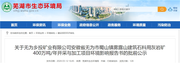 近日,安徽省蕪湖市生態(tài)環(huán)境局發(fā)布無(wú)為市蜀山鎮(zhèn)霧露山400萬(wàn)噸/年砂石開(kāi)采與加工項(xiàng)目環(huán)評(píng)批前公示。該項(xiàng)目總投資20億元,建設(shè)單位為無(wú)為鄉(xiāng)投礦業(yè)有限公司。