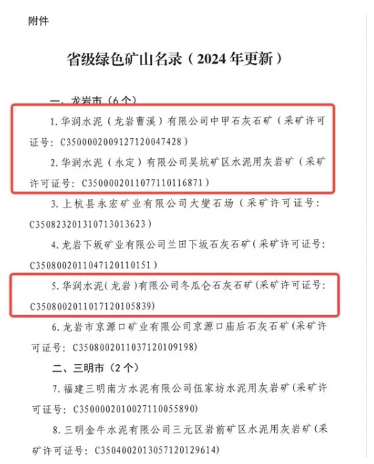3月20日,福建省自然資源廳印發(fā)《關(guān)于更新2024年省級(jí)綠色礦山名錄的通知》,華潤(rùn)建材科技東南大區(qū)龍巖曹溪水泥中甲石灰石礦、永定水泥吳坑礦區(qū)水泥用灰?guī)r礦、龍巖水泥冬瓜侖石灰石礦成功入選。