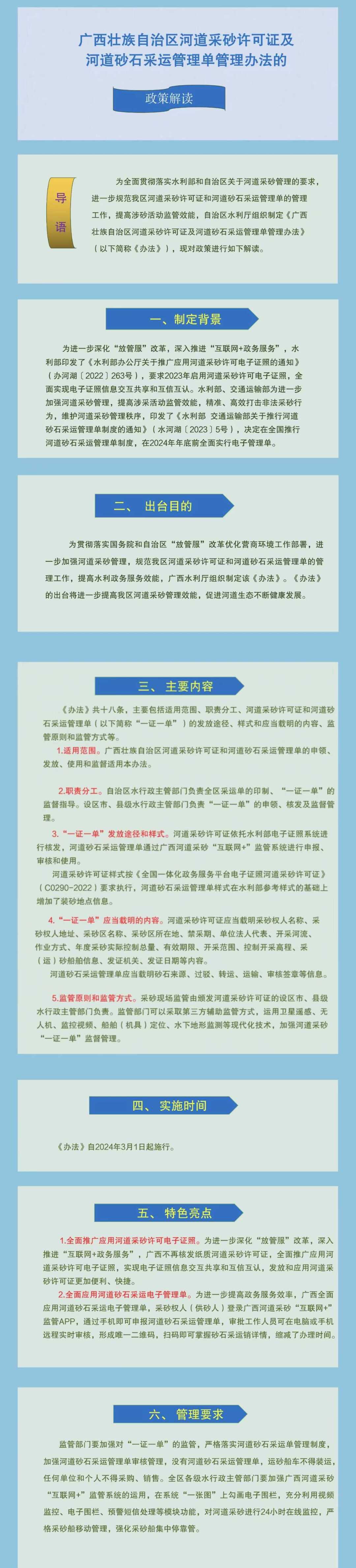 為全面貫徹落實水利部和廣西自治區(qū)關于河道采砂管理的要求,進一步規(guī)范廣西河道采砂許可證和河道砂石采運管理單的管理工作,提高涉砂活動監(jiān)管效能,廣西壯族自治區(qū)水利廳組織制定《廣西壯族自治區(qū)河道采砂許可證及河道砂石采運管理單管理辦法》。