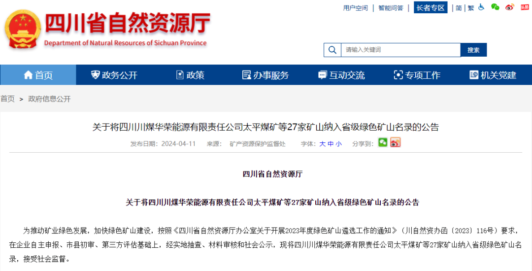 4月11日,記者從四川省自然資源廳網(wǎng)站獲悉,四川省自然資源廳發(fā)布公告,按照此前印發(fā)的《關(guān)于開展2023年度綠色礦山遴選工作的通知》要求,在企業(yè)自主申報(bào)、市縣初審、第三方評(píng)估基礎(chǔ)上,經(jīng)實(shí)地抽查、材料審核和社會(huì)公示,將四川川煤華榮能源有限責(zé)任公司太平煤礦等27家礦山納入省級(jí)綠色礦山名錄。