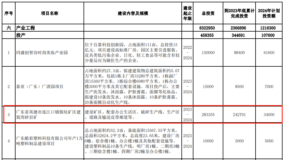 根據(jù)廣東清遠(yuǎn)市發(fā)展和改革局發(fā)布的清遠(yuǎn)市2024年重點建設(shè)項目計劃顯示, 廣東省英德市連江口鎮(zhèn)銀坑礦區(qū)建筑用砂巖礦2024年將投產(chǎn)。項目總投資28.33億元,到2023年底累計完成投資24.27億元,2024年計劃投資額3.4億元。