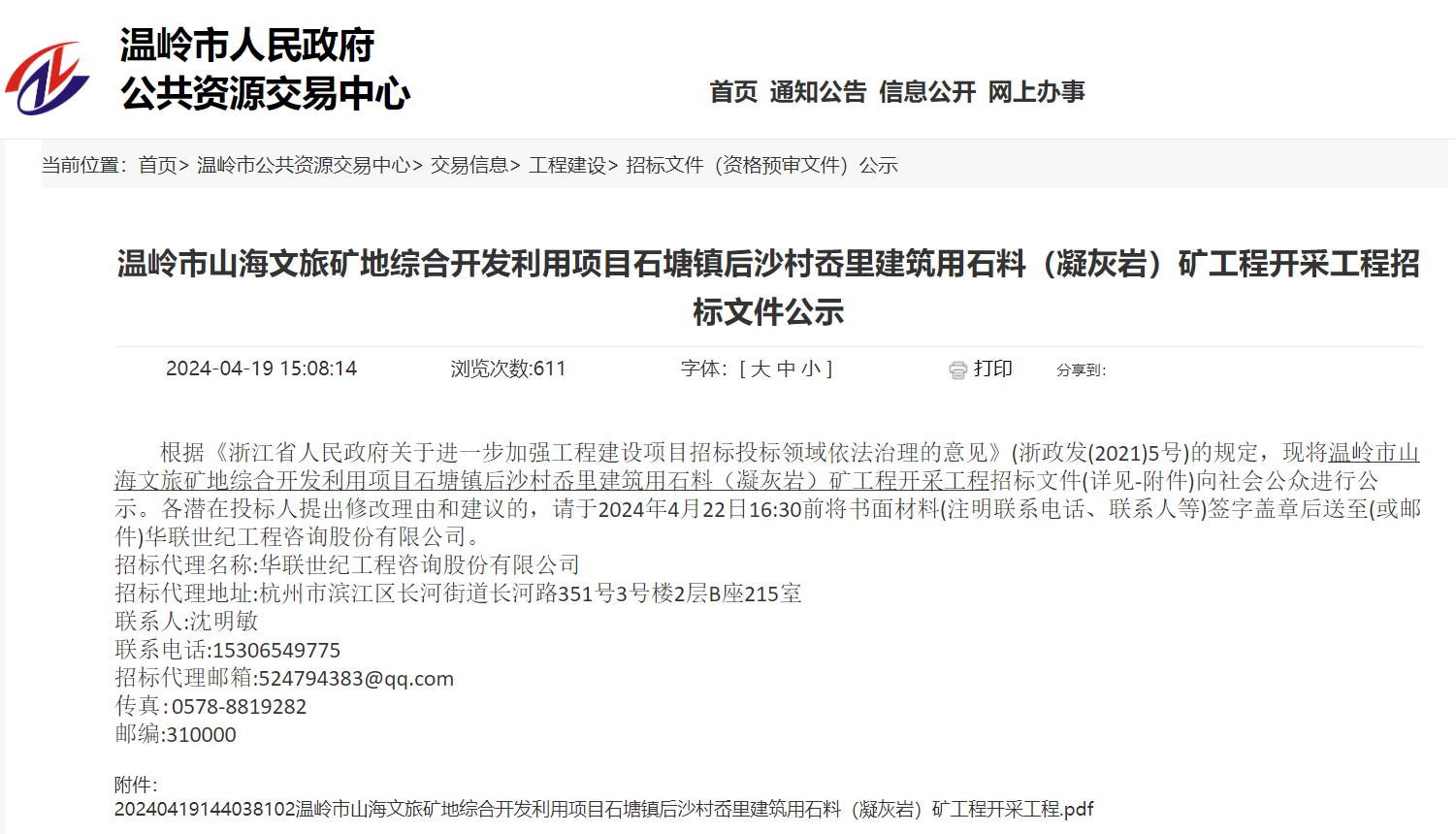 近日,浙江省臺州市溫嶺市公共資源交易中心發(fā)布了溫嶺市山海文旅礦地綜合開發(fā)利用項目石塘鎮(zhèn)后沙村岙里建筑用石料(凝灰?guī)r)礦工程開采工程招標(biāo)文件(資格預(yù)審文件),這標(biāo)志著此項工程..