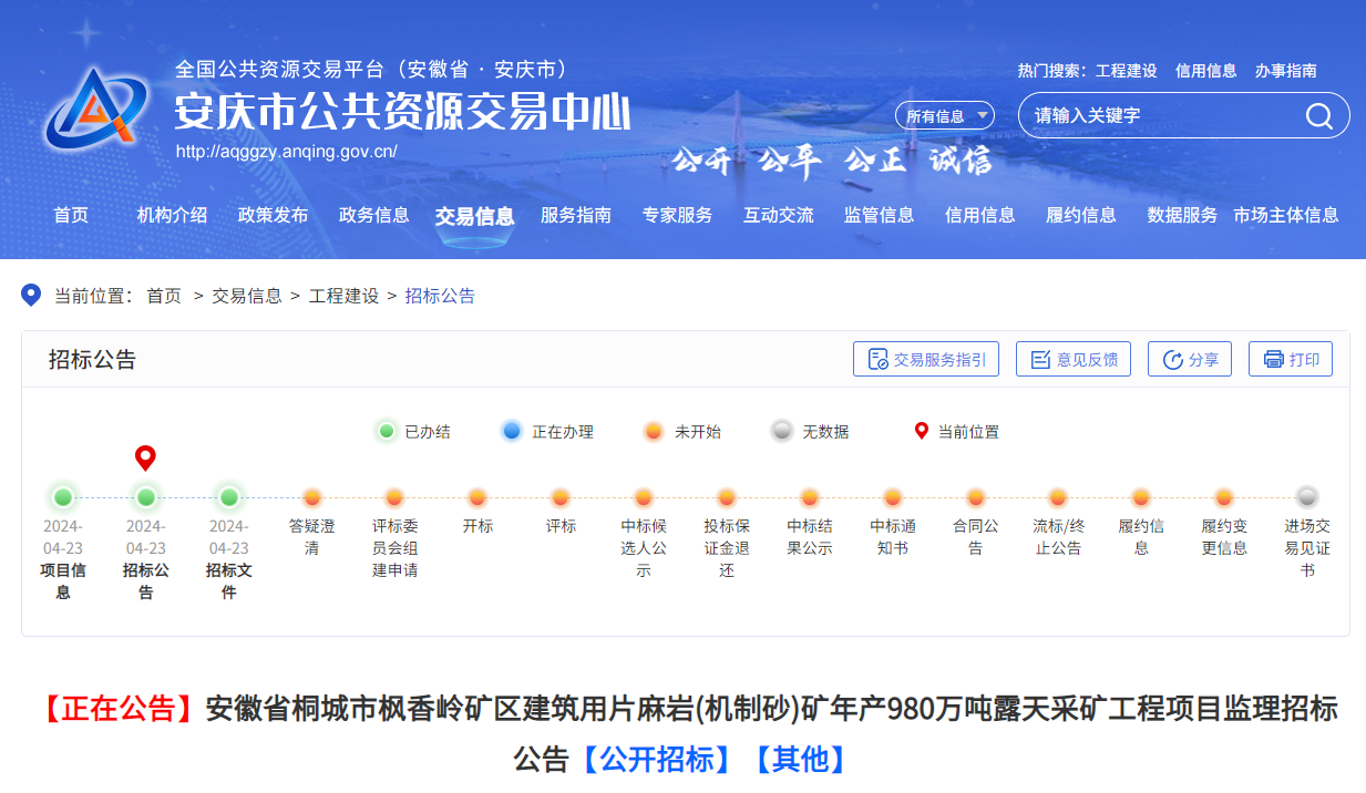 招標(biāo)金額超4億元!安徽桐城年產(chǎn)980萬噸砂石項目監(jiān)理招標(biāo)