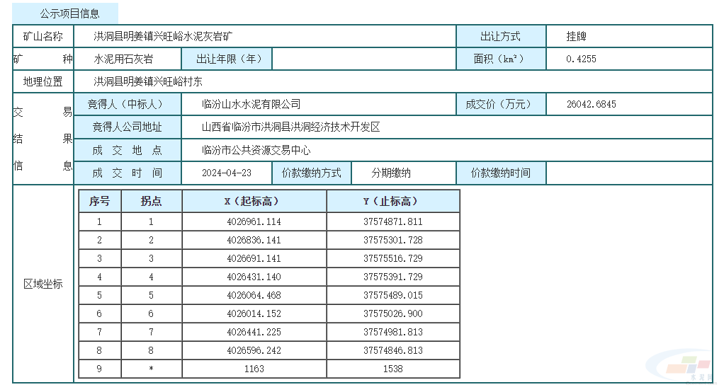 臨汾山水水泥2.6億元擬競得一水泥用石灰?guī)r礦采礦權(quán)