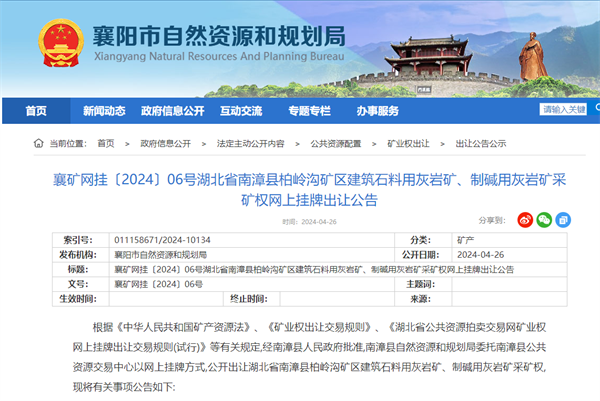 該項(xiàng)目位于南漳縣武安鎮(zhèn)三股泉村,礦權(quán)名稱湖北省南漳縣柏嶺溝礦區(qū)建筑石料用灰?guī)r礦、制堿用灰?guī)r礦,年生產(chǎn)規(guī)模建筑石料用灰?guī)r礦500萬噸,掛牌起始價(jià)1.15億元(11489萬元),出讓年限21.3年(含基建期1年)。