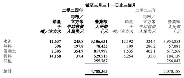 季度報顯示,一季度水泥、熟料、混凝土及骨料的毛利率分別為11.3%、2.3%、13%及35.3%,綜合毛利率為13.8%,同比上升1.8%,主要原因為骨料銷量同比上升。