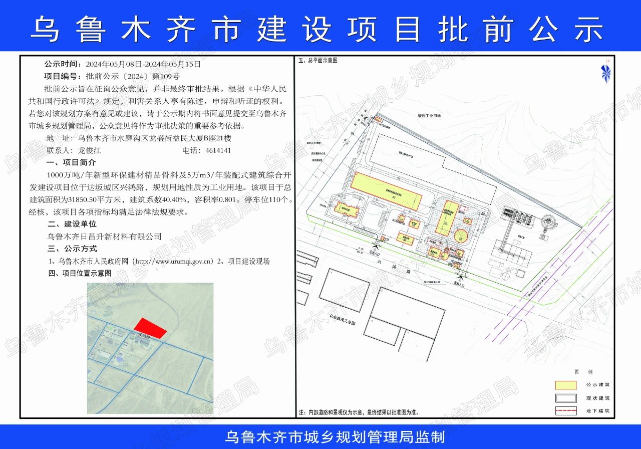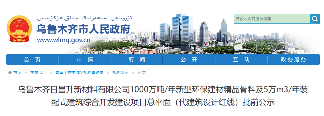 近日,烏魯木齊市人民政府公示日昌升新材料有限公司投資5.6億元年產(chǎn)1000萬噸綠色高品質(zhì)骨料線綜合開發(fā)建設(shè)項目總平面(代建筑設(shè)計紅線)。