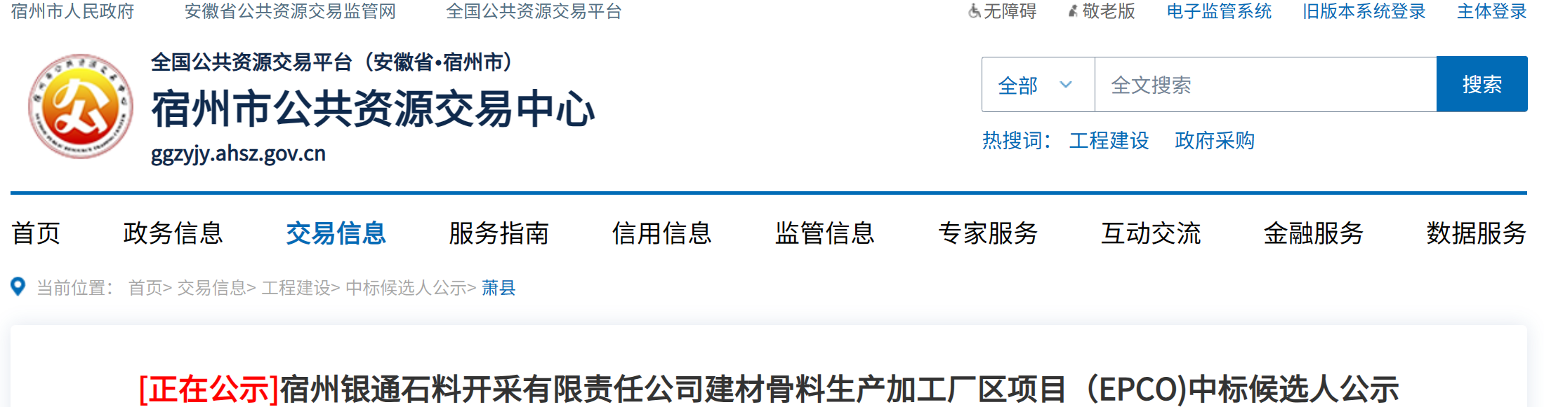 6月18日,安徽省宿州市公共資源交易中心發(fā)布宿州銀通石料開采有限責任公司建材骨料生產(chǎn)加工廠區(qū)項目(EPCO)中標候選人公示。第一候選人為中鐵十九局集團有限公司聯(lián)合體,聯(lián)合體成員為蘇州中材非金屬礦工業(yè)設(shè)計研究院有限公司。投標報價,建筑安裝工程費(費率)為91.6%(約2.579億元),生產(chǎn)承包費用綜合單價為18.7元/噸,運營期為10年。