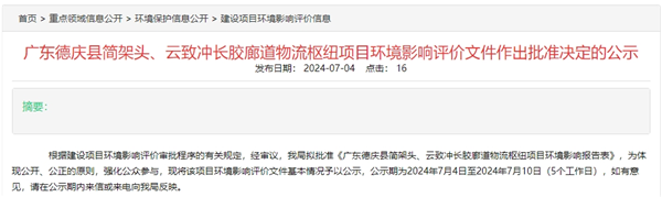 7月4日,廣東省肇慶市德慶縣人民政府發布中能建廣東簡架頭、云致沖礦區1600萬噸/年砂石項目長膠廊道物流樞紐項目獲批公示,運輸廊道全長約3.41千米。