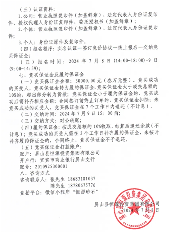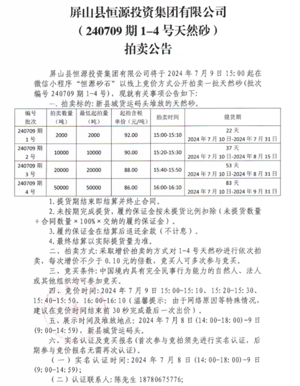7月8日,四川省宜賓市屏山縣恒源投資集團發布線上競價方式公開拍賣一批天然砂公告。公告指出,該公司將采取增價拍賣的方式對1-4號天然砂進行依次拍賣,起拍量2000噸-5萬噸不等,起始單價86元/噸-92元/噸不等,提貨期22-83天不等。 據悉,1-4號天然砂堆放在新縣城貨運碼頭,競拍人可在2024年7月9日3點之前看貨,3點之后開始競價。