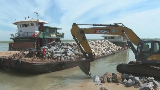 自7月6日起,石首市五碼口防汛專用碼頭,一輛接著一輛運送砂石料的貨車駛入,將砂石料卸到碼頭邊,挖掘機開足馬力,砂石料被轉運到貨船上,這些滿載著砂石料的貨船將從此處沿江進入洞庭湖,運往華容縣幫助封堵決口。