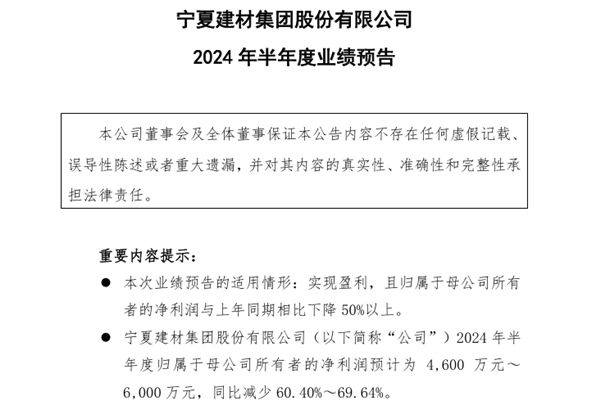 7月8日,寧夏建材發布公告稱,預計2024年半年度歸屬于母公司所有者的凈利潤為4600萬元-6000萬元,同比減少60.40%-69.64%。
